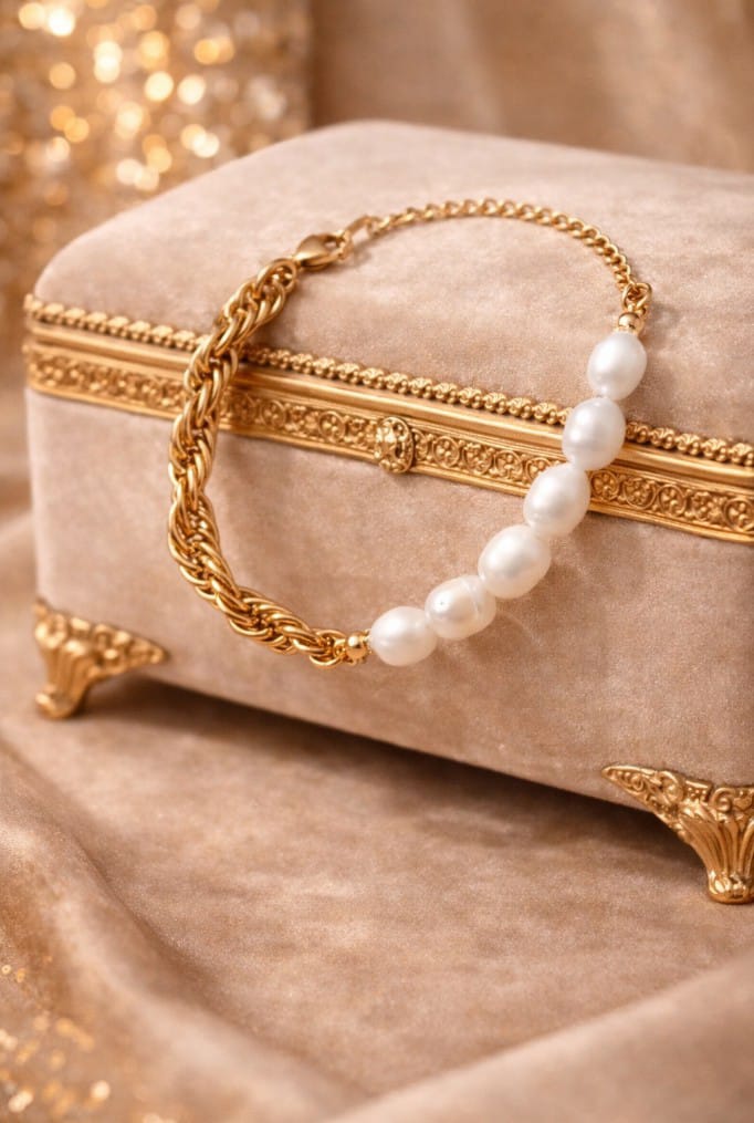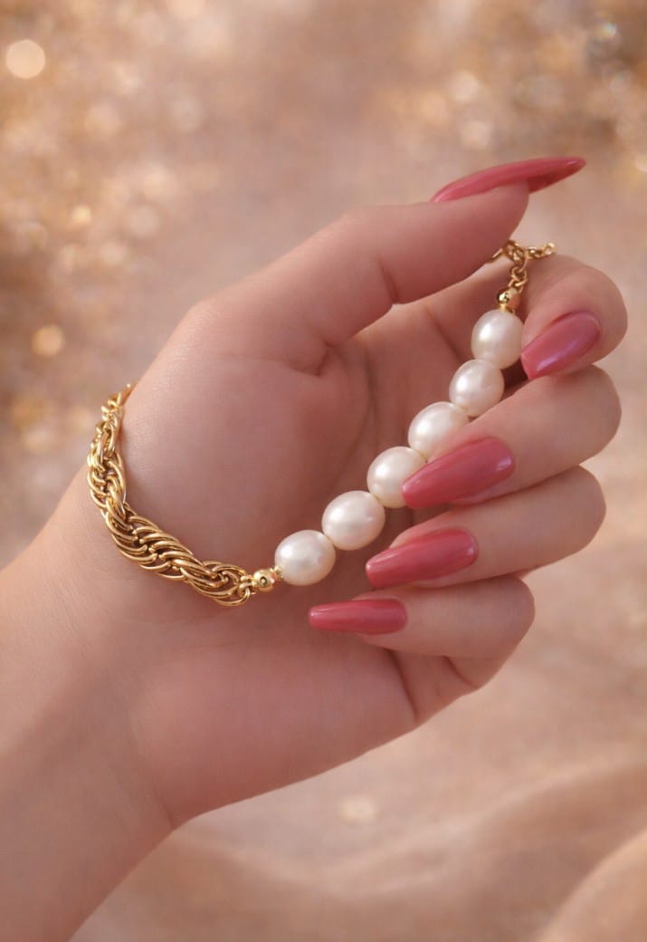 Elegantes Armband mit echten Süßwasserperlen, kombiniert mit einer hochwertigen Kette aus Edelstahl mit 18K PVD-Vergoldung.